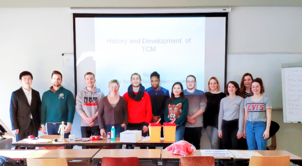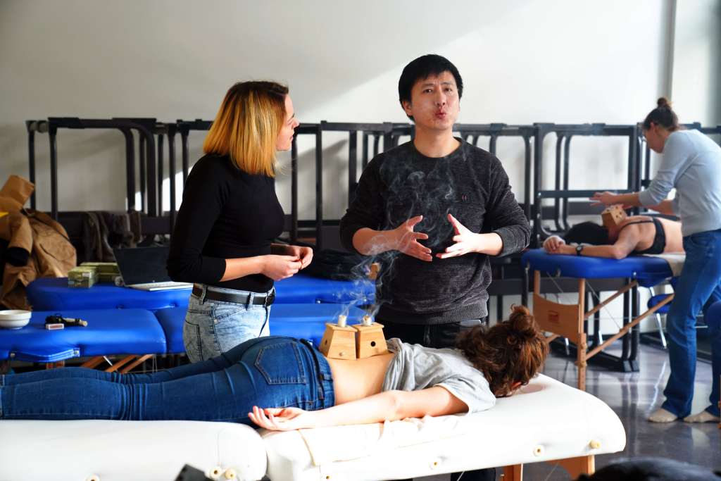 交流期間,蘇彬用英語向瑞士的師生介紹了中國康復醫學發展現狀,詳細講解并演示了中國傳統康復醫學(Traditional Chinese Medicine,TCM)的發展現狀、基礎理論和實踐技能,包括陰陽學說、五行學說、藏象學說和經絡。學院的教授和學生們表示對中國傳統康復醫學非常感興趣,課堂互動交流氣氛活躍。一些學生感言:“中醫是如此的神奇!”