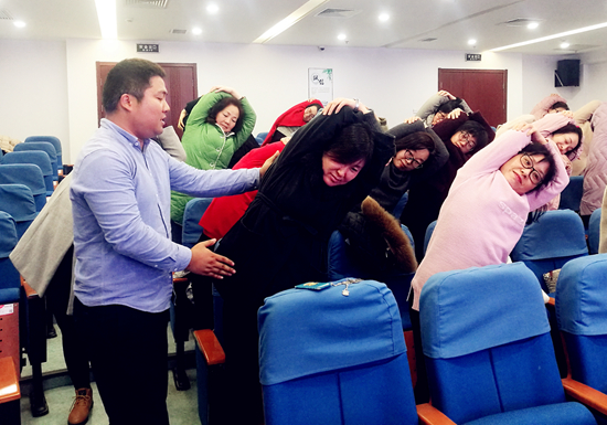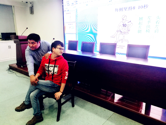 “每天六分鐘、頸肩腰腿都不痛,辦公室里可運動,燃燒我的卡路里”在謝玉寶主管治療師的口號下,女教職工們紛紛起立,學做起了“辦公室脊柱康復操”。現場桂云杰治療師演示,講解動作要領,臺上臺下互動熱烈。一套動作下來,大家紛紛表示頸肩腰腿明顯得到休息和放松,保健操簡單實用、易學易會,這種干貨滿滿的講座實在受益匪淺。