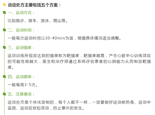 運(yùn)動(dòng)處方跟藥物處方類似,醫(yī)生在開(kāi)運(yùn)動(dòng)處方之前會(huì)對(duì)患者進(jìn)行系統(tǒng)評(píng)估,比如患者的生活習(xí)慣,喜歡什么樣的運(yùn)動(dòng),通過(guò)心肺運(yùn)動(dòng)試驗(yàn)或六分鐘步行試驗(yàn)等來(lái)評(píng)估患者的心肺功能,制定個(gè)體化的運(yùn)動(dòng)處方。