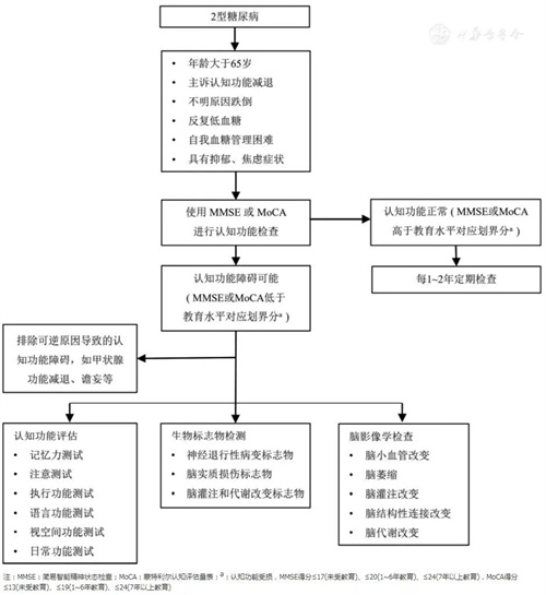 2型糖尿病患者具有多個認知域的功能障礙,對2型糖尿病患者認知功能減退的早期篩查十分重要。常用的篩查與診斷工具包括神經心理評估量表、生物學標志物和腦影像學檢查。評估結果如為認知障礙低風險,則應每1-2年持續監測;如為高風險,則需再進行詳細的神經心理學測試。在評估過程中,排除并治療常見的可逆性認知功能障礙也很重要,包括譫妄、藥物不良反應、代謝或內分泌異常、睡眠障礙和抑郁癥等。